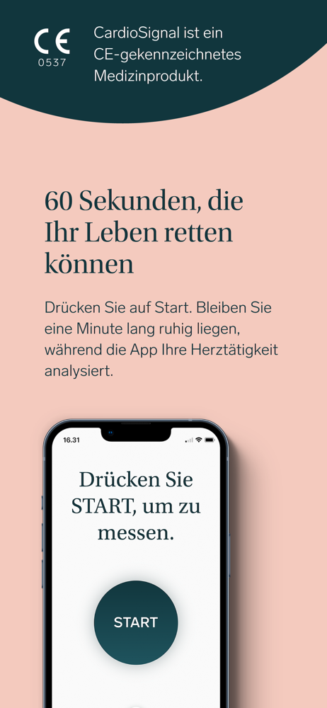 Die App ist einfach zu bedienen: Legen Sie sich hin und entspannen Sie sich. Tippen Sie auf die Starttaste der App und platzieren Sie Ihr Smartphone in die Mitte Ihrer Brust. Die Messung dauert 60 Sekunden, danach erhalten Sie in wenigen Sekunden das Ergebnis.