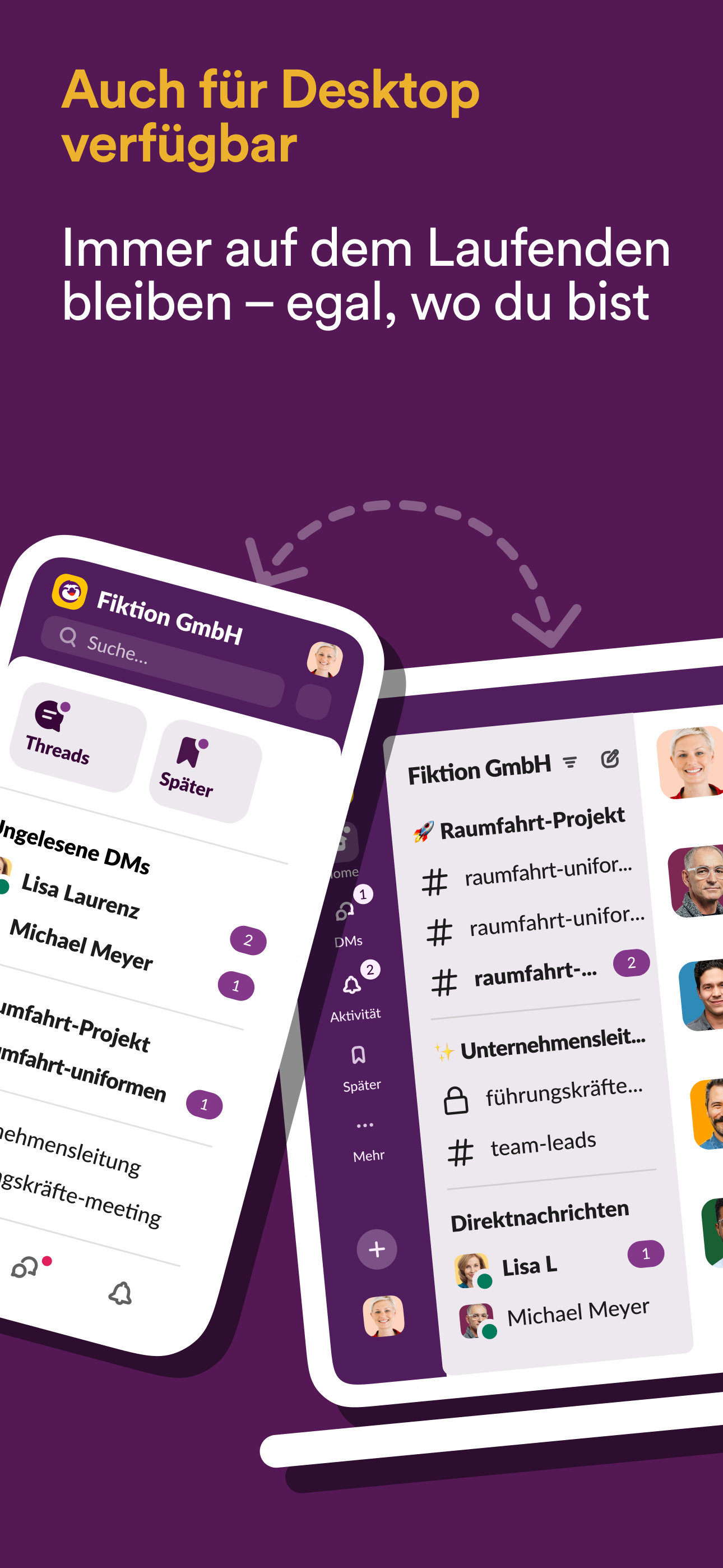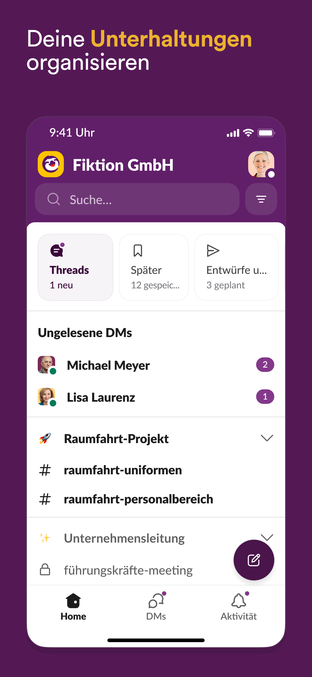 • Mit deinem Team kommunizieren und deine Unterhaltungen nach Themen, Projekten oder allem Anderen, das für deine Arbeit wichtig ist, organisieren