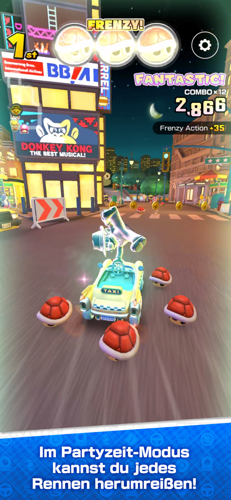Es ist kein Geheimnis, dass Items jedes Mario Kart-Rennen auf den Kopf stellen können, aber jetzt gibt es obendrein noch die Partyzeit! Gelingt es dir, drei gleiche Items zu sammeln, dann wird der Partyzeit-Modus aktiviert, in dem du unverwundbar bist und über unendlich viele Items verfügst! Schieße aus allen Rohren, denn auch die schönste Party geht einmal zu Ende!