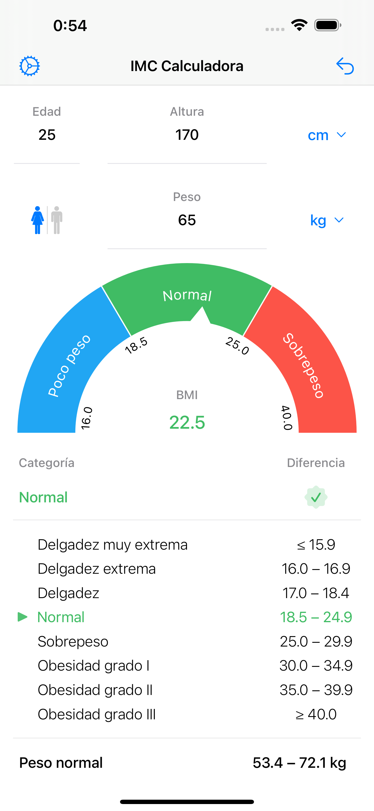 Es la aplicación complementaria ideal para su programa de pérdida de peso. No importa si usted quiere perder peso o ganar peso, esta aplicación puede ayudarle a evaluar su peso actual.