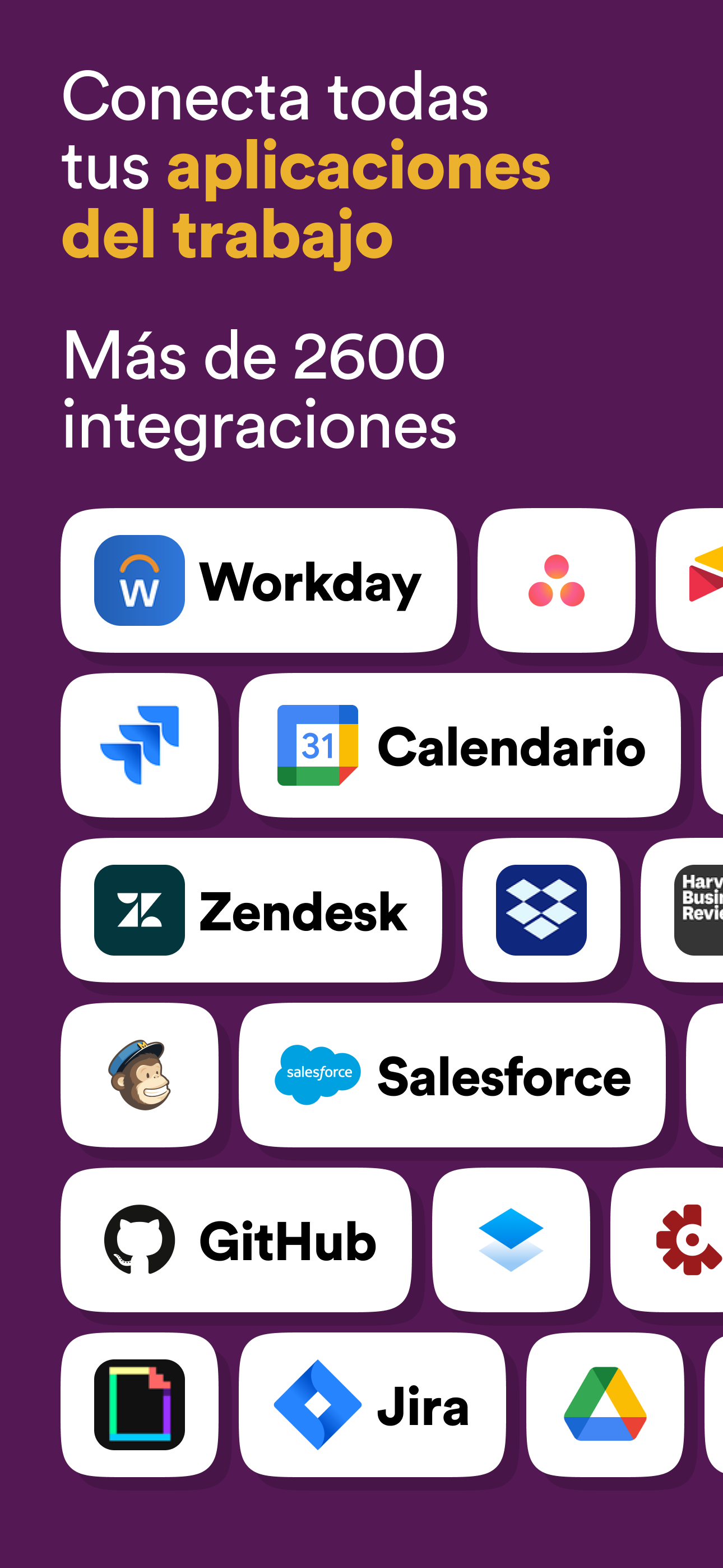• Integrar en tu flujo de trabajo las herramientas y servicios que ya utilizas, como Google Drive, Salesforce, Dropbox, Asana, Twitter, Zendesk y mucho más.