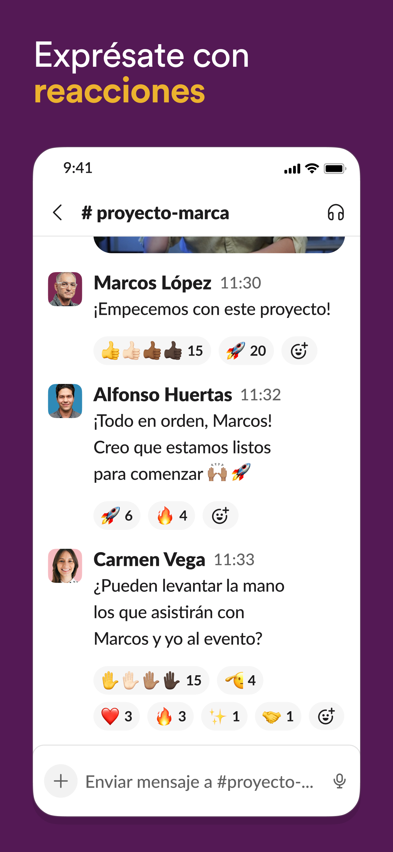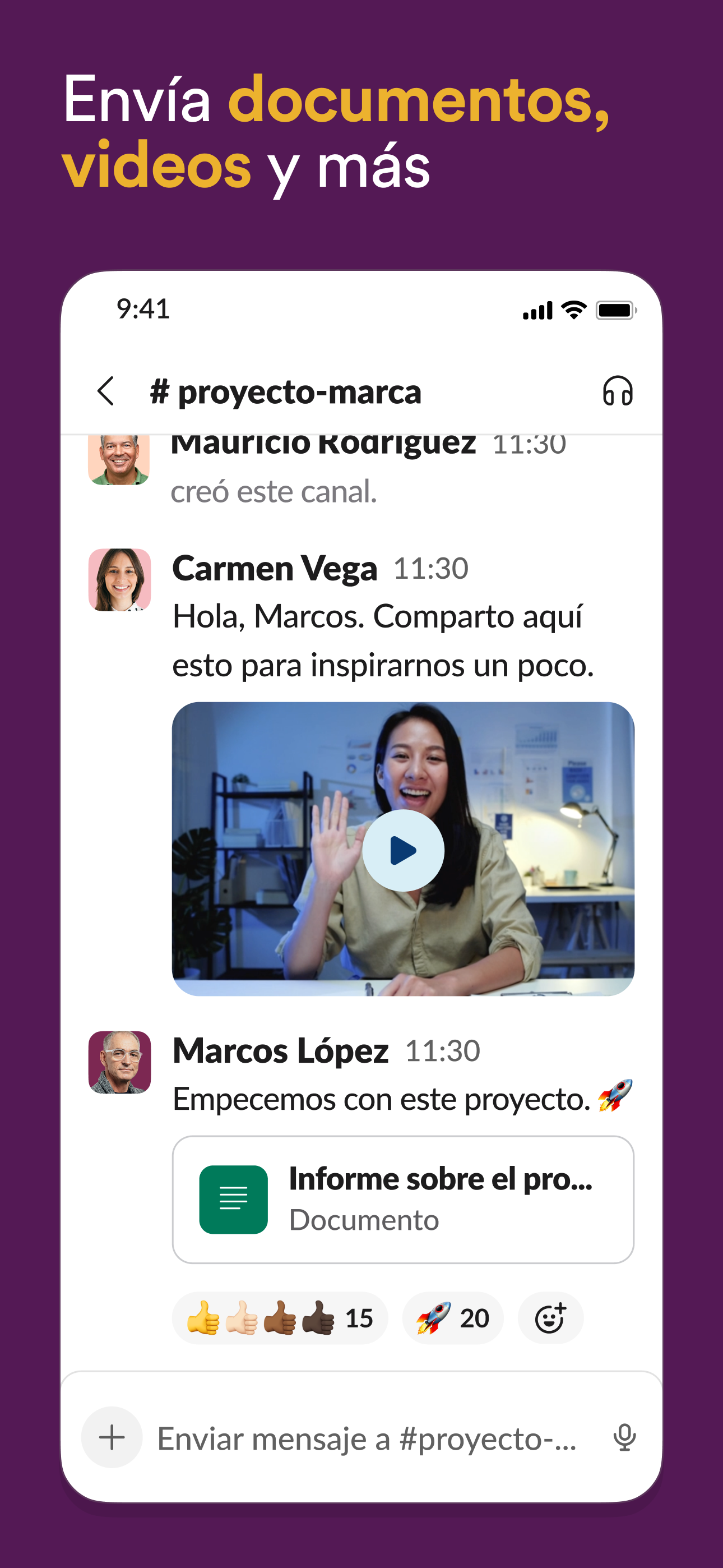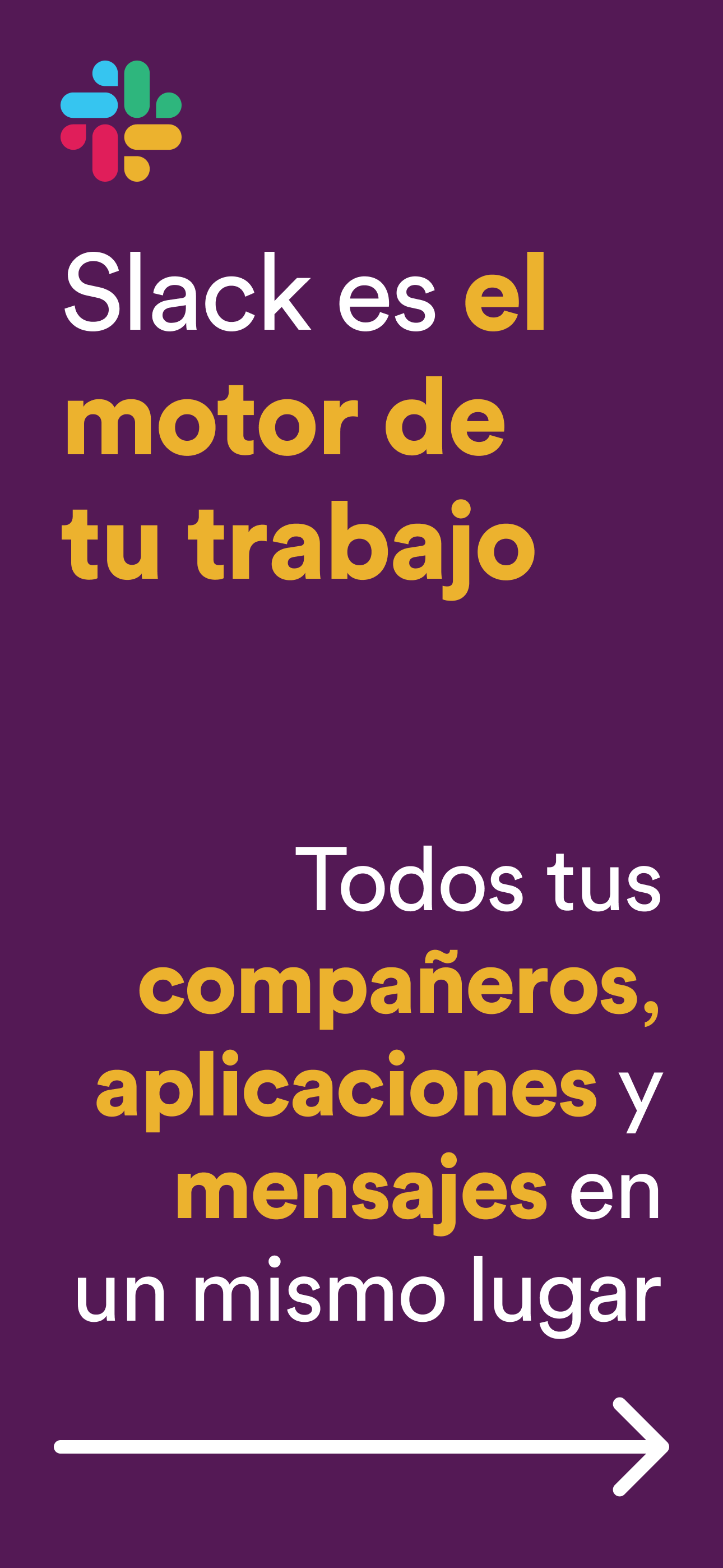 Slack combina la comunicación y colaboración en equipo en un mismo lugar, haciendo que aumente la productividad en el trabajo, tanto en grandes empresas como en pequeños negocios. Vete tachando los elementos de tu lista de tareas pendientes y haz que avancen los proyectos, juntando las personas, conversaciones, herramientas e información que necesitas. Slack se encuentra disponible en cualquier dispositivo, de forma que puedas encontrar y acceder a tu equipo y tu trabajo, tanto si estás sentado en tu escritorio como si te encuentras fuera de la oficina.