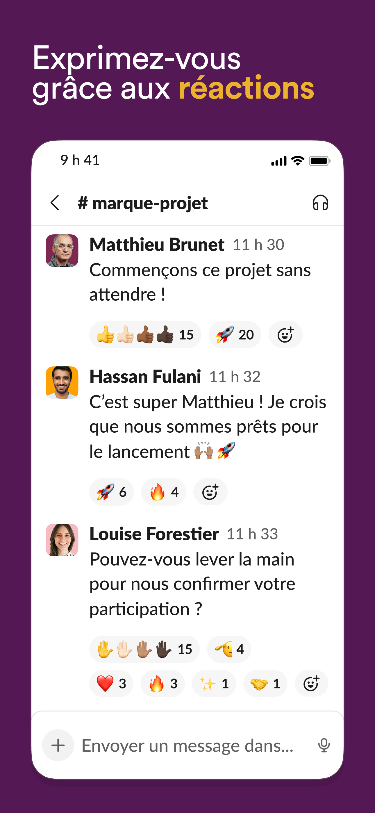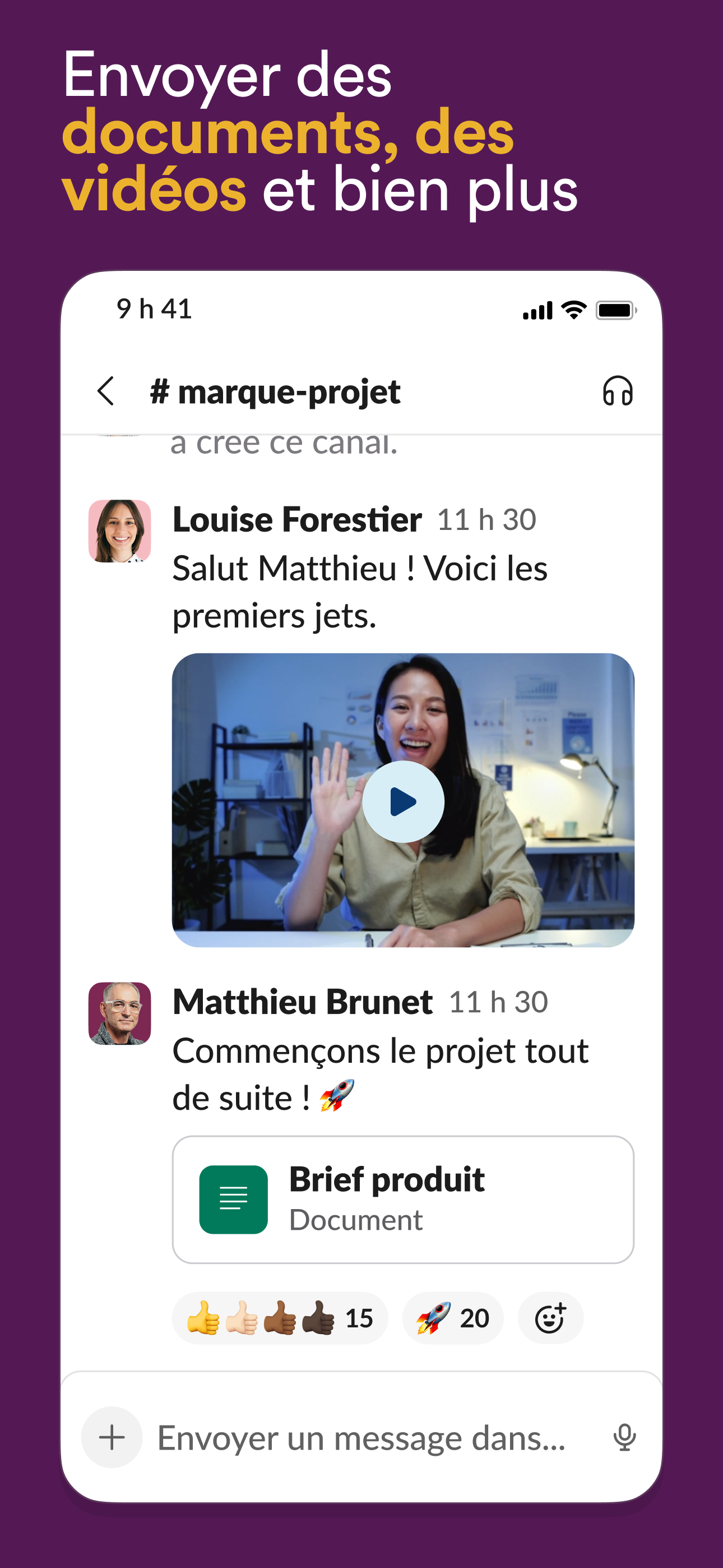 • Communiquer avec votre équipe et organiser vos conversations par thèmes, par projets, ou selon les besoins de votre travail.
