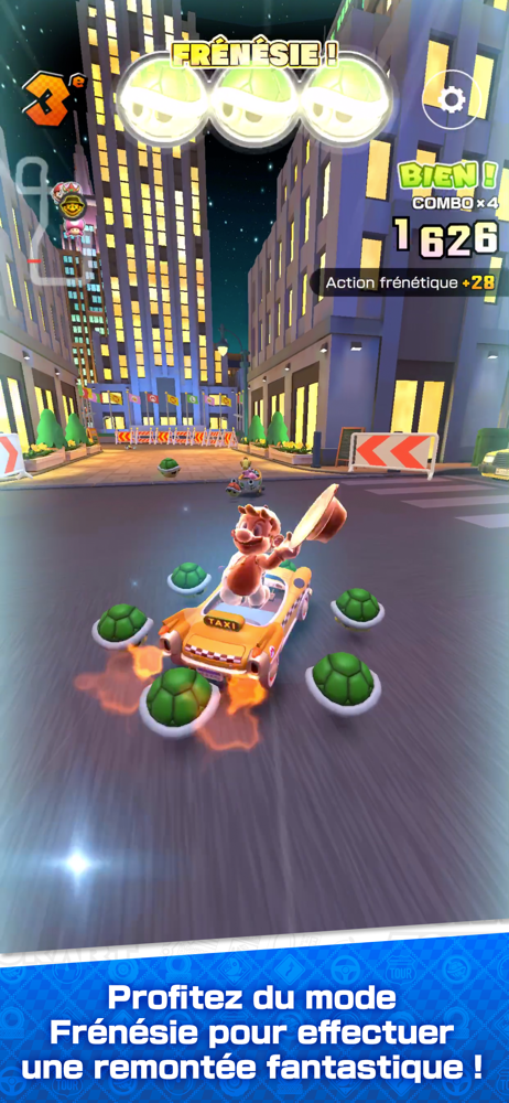 Mario Kart Tour vous donne accès à une panoplie de puissants objets permettant de semer la zizanie sur le circuit ! Vous pourrez même passer à la vitesse supérieure en activant le nouveau mode Frénésie afin de bénéficier de quelques instants d’invincibilité, combinés à une quantité infinie d’un objet spécifique ! Profitez-en, l’effet ne dure pas longtemps !