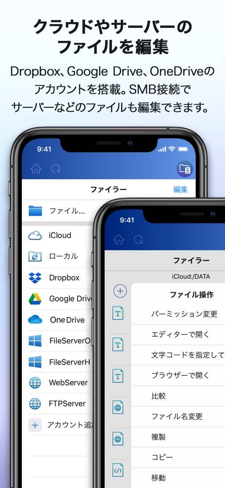 SMB接続に対応。サーバーやNASデバイスのファイルを直接編集。
