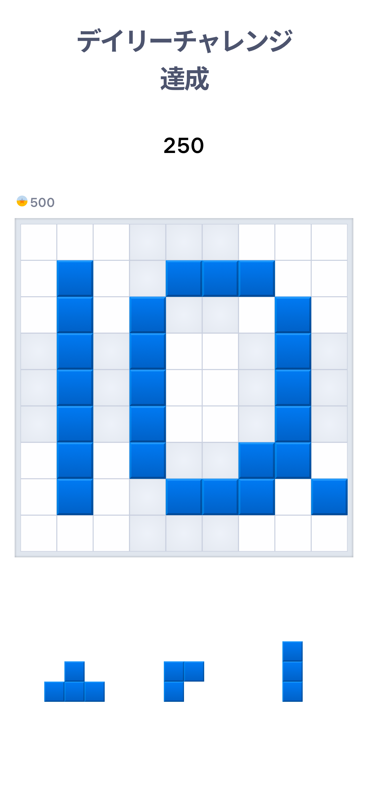 • ボードがいっぱいにならないよう、ブロックを配置して一手ごとにラインや3x3のマスを破壊しましょう。