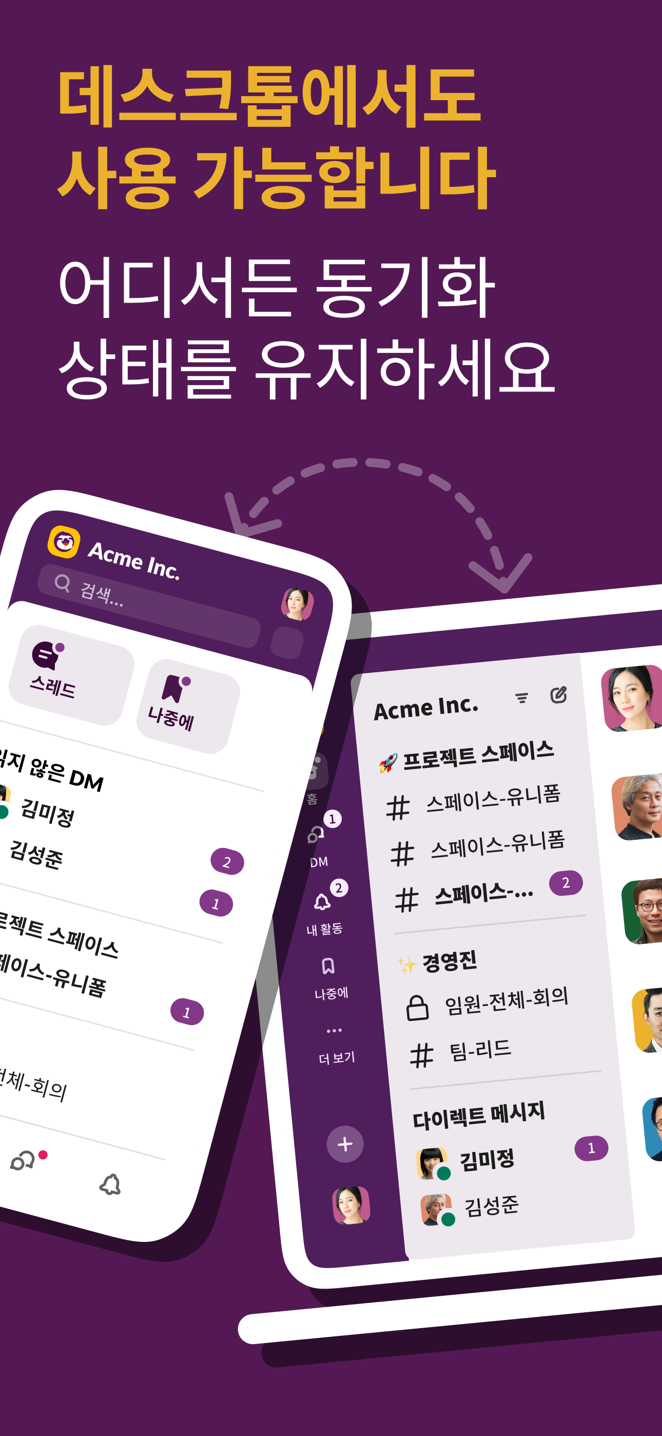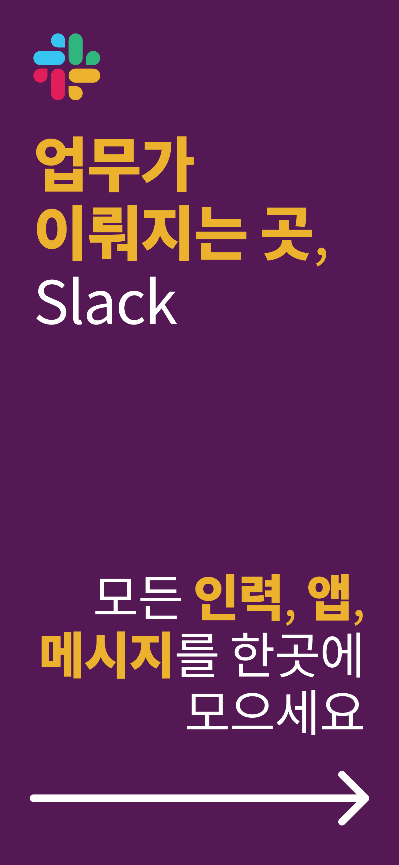 “대기업이든 중소기업이든, Slack은 업무를 더 많이 수행할 수 있도록 팀 커뮤니케이션과 협업을 한곳으로 모아줍니다. 필요한 정보, 알맞은 사람, 대화 및 도구를 한곳으로 모아서 해야 할 일 목록을 지워나가고 프로젝트를 진행시키세요. Slack은 어떤 기기에서든 사용할 수 있어 사무실에 있든 이동 중이든 팀과 작업을 찾고 액세스할 수 있습니다.