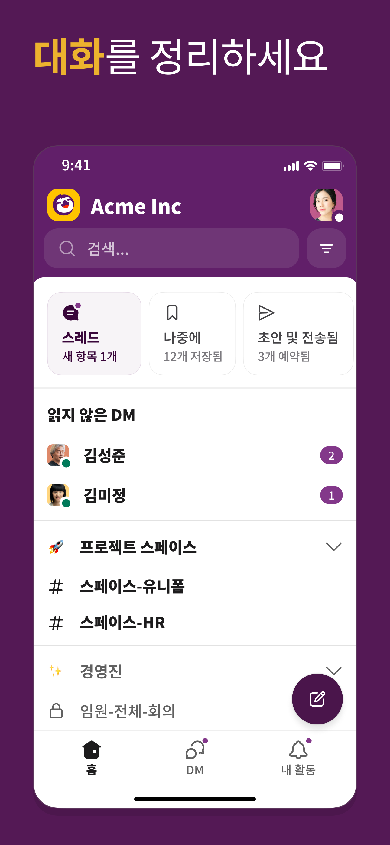 • 팀과의 커뮤니케이션 및 주제, 프로젝트 또는 업무에 중요한 기타 사항에 따라 대화를 정리