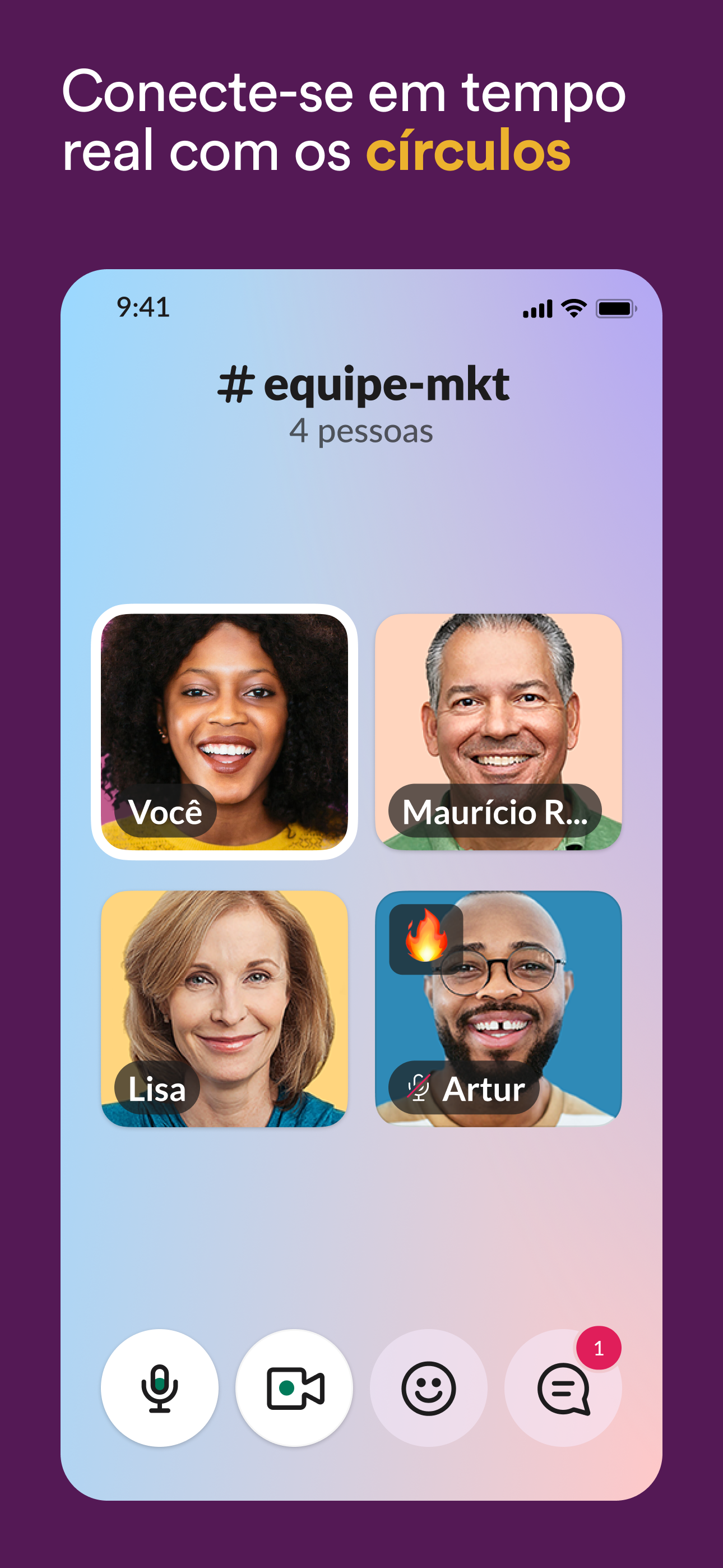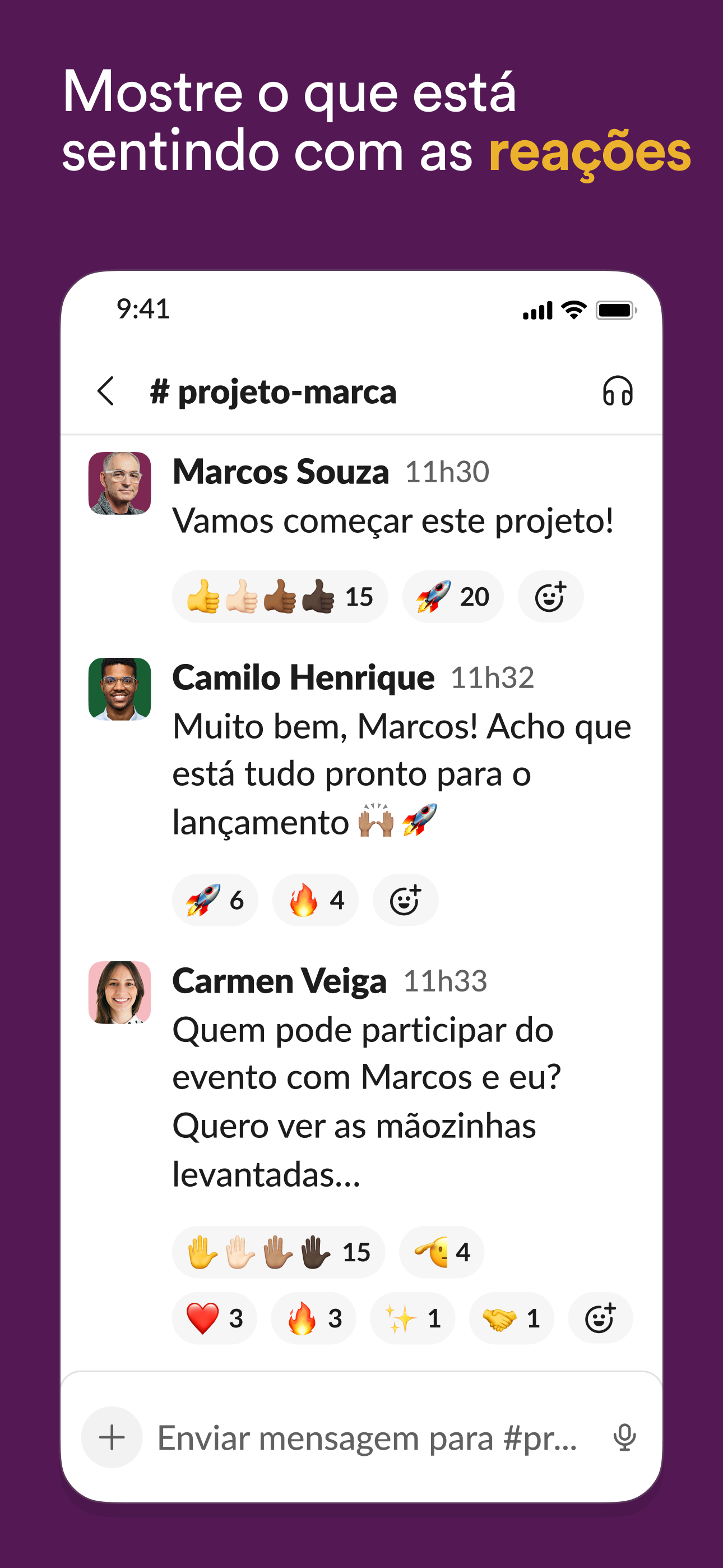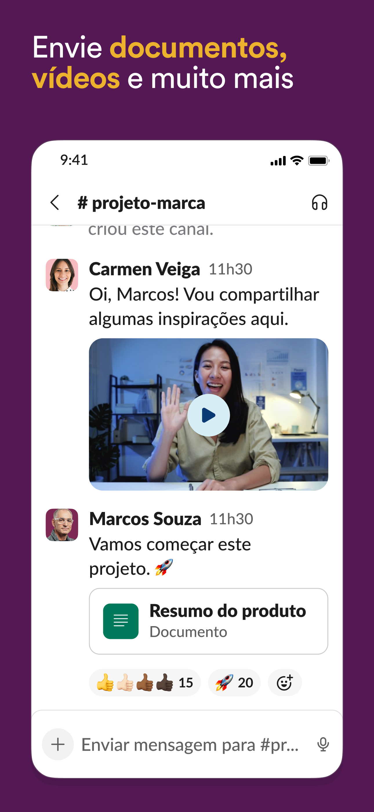 • Comunicar-se com a equipe e organizar conversas por assunto, projeto ou qualquer outro tema importante para o trabalho.