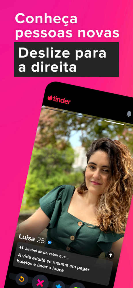 É fácil e divertido encontrar gente nova no Tinder®. Use suas melhores fotos pra destacar o seu perfil e fale um pouco sobre você para aumentar as chances de dar match. Deslize pra direita para curtir alguém ou pra esquerda para passar. Se alguém curtir seu perfil de volta, deu match! E é tudo sem pressão, viu? O interesse precisa ser mútuo pra dar match. Quantos sites de relacionamento são assim?